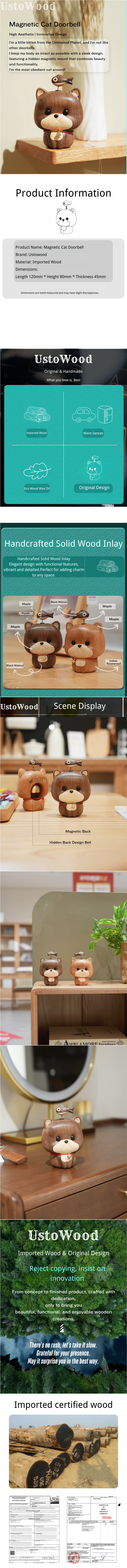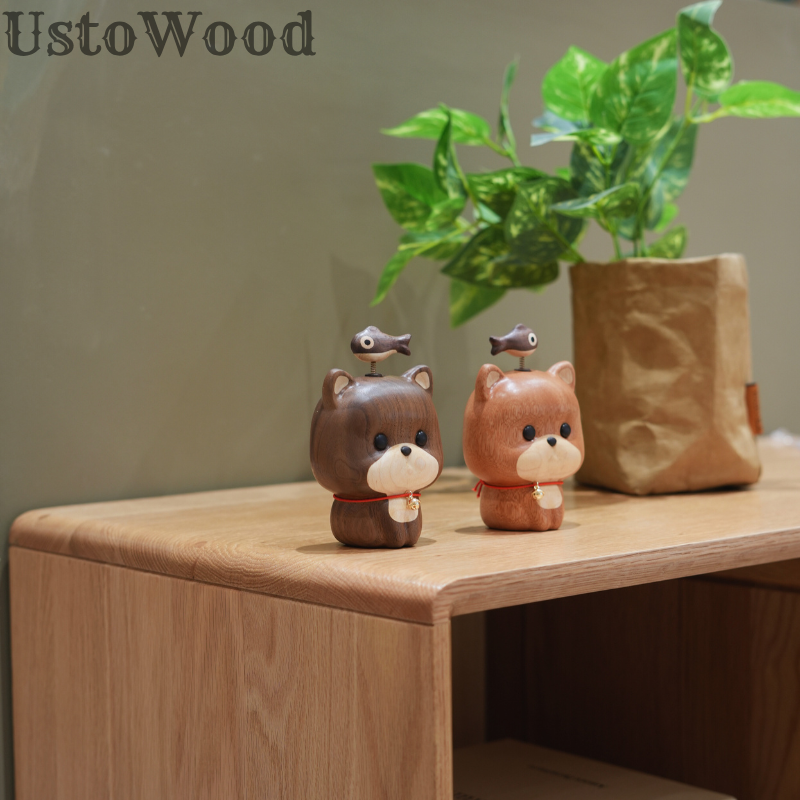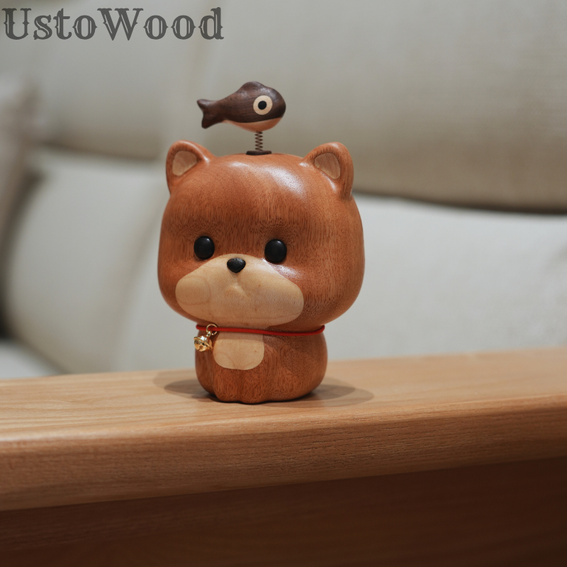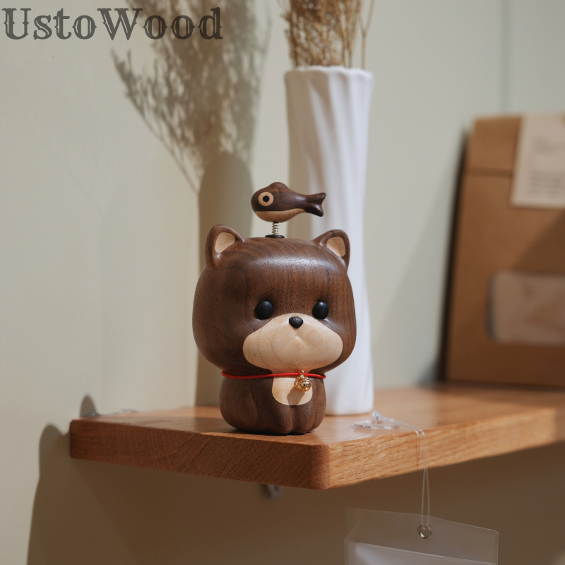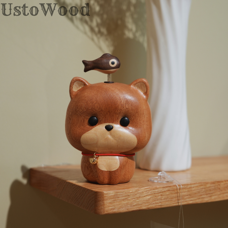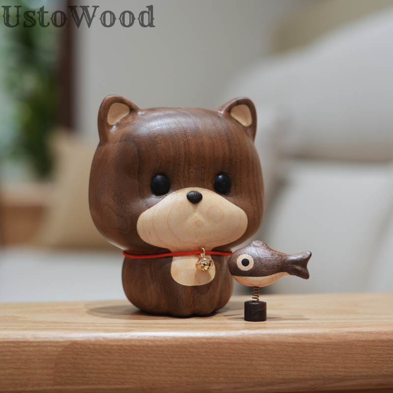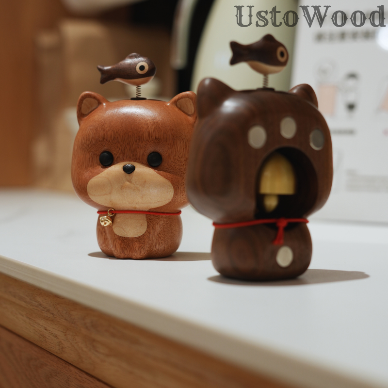 • UstoWood Cat Doorbell Figurine - Wooden Cat with Fish Spring Decoration