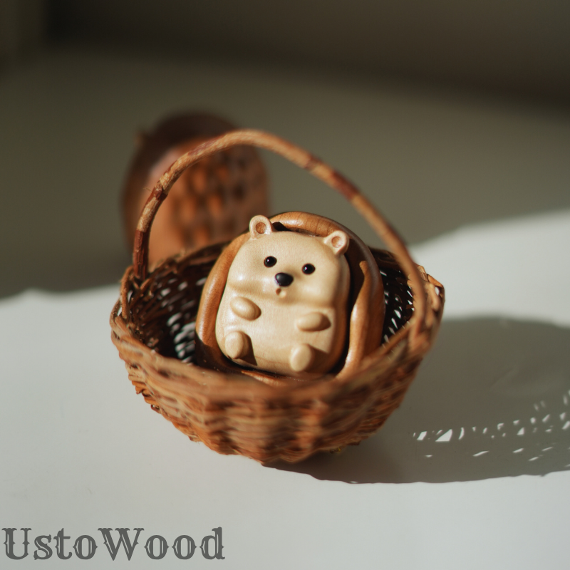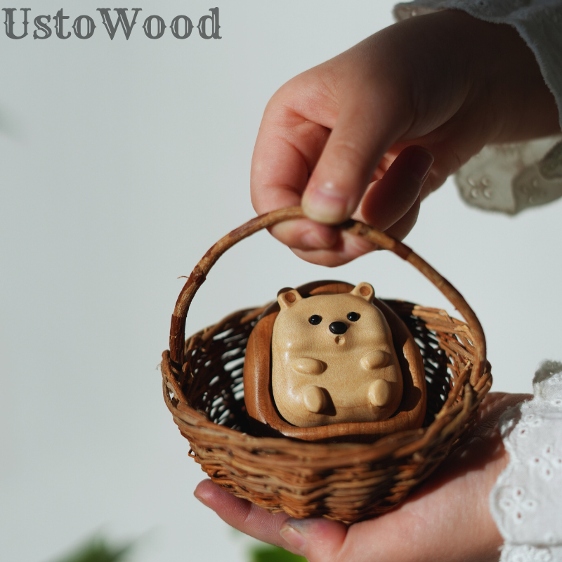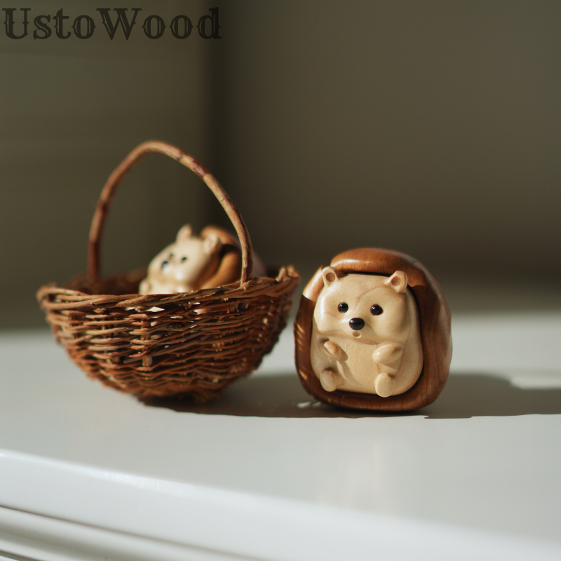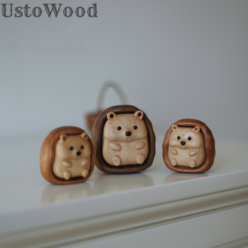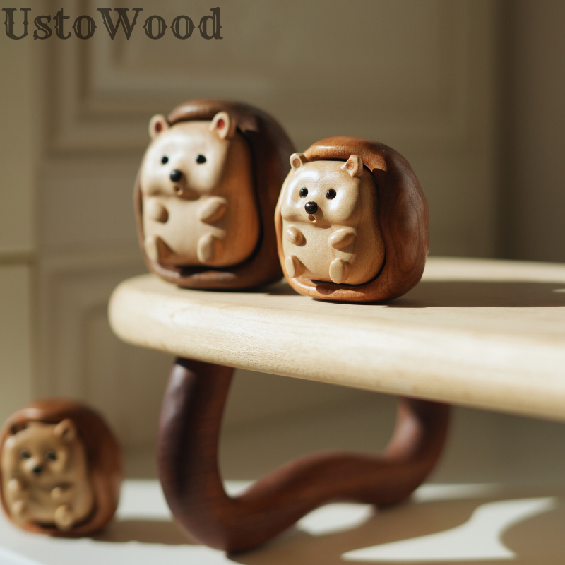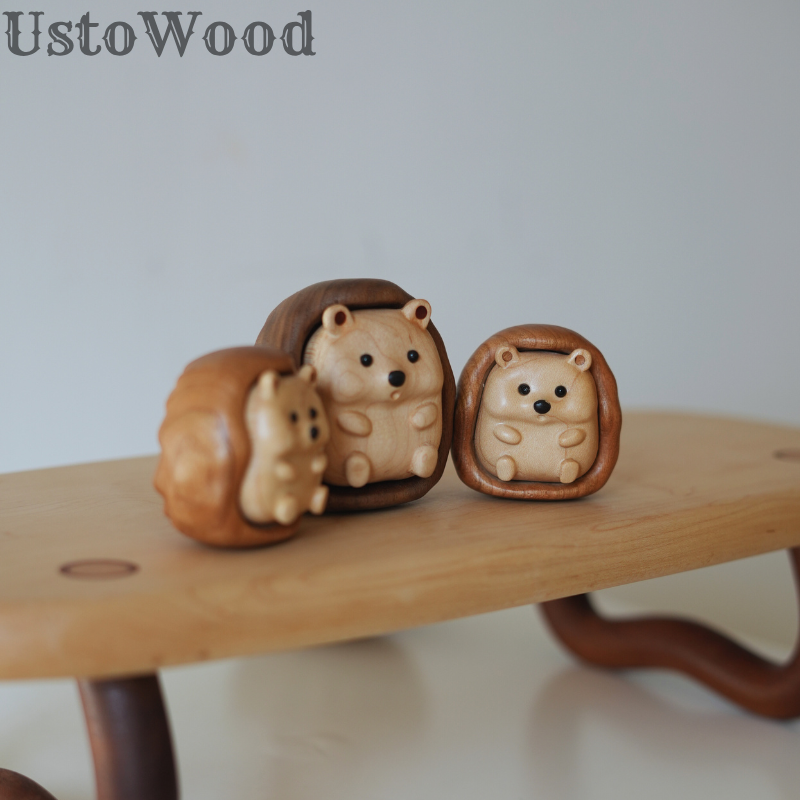UstoWood Hedgehog Figurines - Wooden Desk Decor (Set of 3)